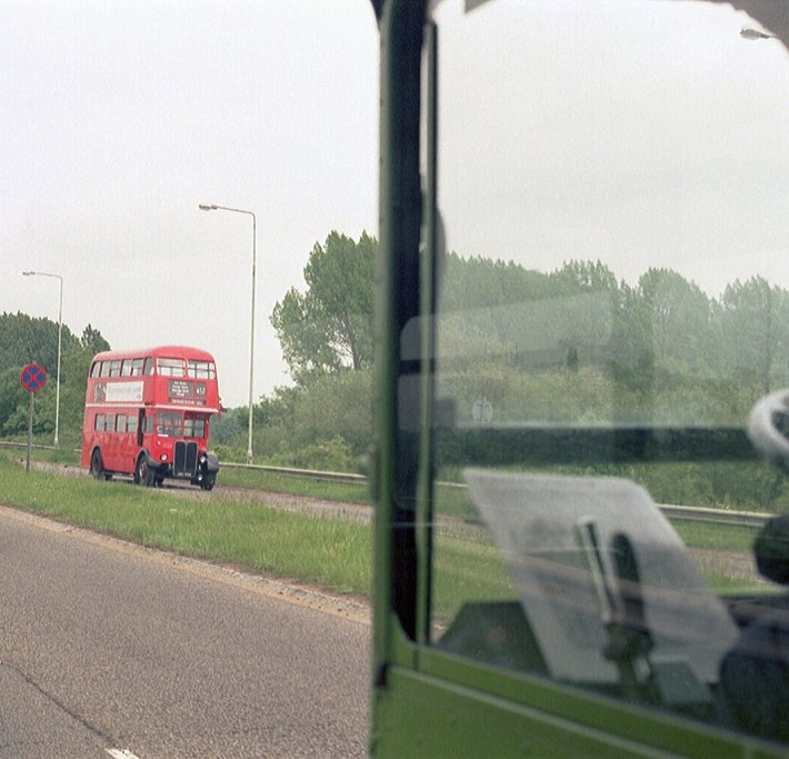 I said hello to Mike and Clive on the Routemaster coach, and found that the front nearside bonnet seat was vacant. We set off, back through the town of Windsor. Greenline RT3491 came the other way on a 441 for Old Windsor. A little further on, in the tight squeeze past the Castle, we met open-top Atlantean STK125T (ex Plymouth Citybus and tour operators), followed immediately by RM1 on the 475.