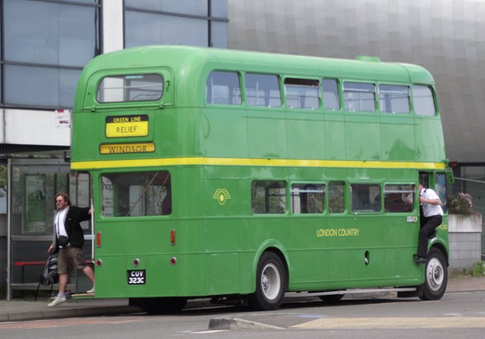 I left the rather quaint Victorian station to be confronted by the awfulness of the backside of modern Slough. I sympathised with John Betjeman. The sight was ameliorated only by RML2323 pulling up beside the shrouded old bus station, having worked in from Harlow on the 724.