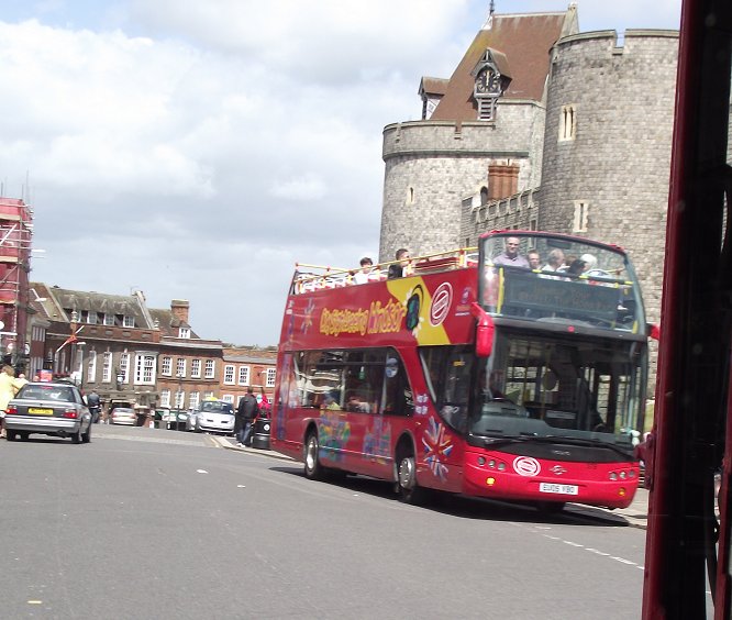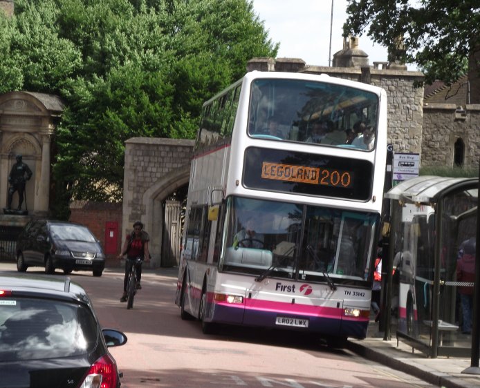There were not many ordinary service buses about, despite the crowds of people, but there was one of Ensignbus' City Sightseeing Ayats-bodied Volvos, No 376, gliding past Windsor Castle with a good load, and at the stop further down was First Berkshire's ex-London Trident TN33142 on the Legoland service.