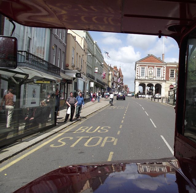 We made a triple passage of Wellington Street between the roundabouts, in order to serve west-bound stop G. In the process we passed behind RM1859 as we first entered the western roundabout. It was west-bound to Cippenham on the 407. We then passed incoming Hants&Dorset Bristol RE 1644, which had worked a Thames Valley route 63 from Maidenhead via Cliveden.