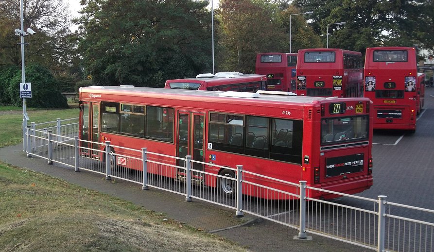 Brooklands Bus Running DaySunday 23rd October 2011Prepared by Ian Smith, 25th October 2011Before the start227: Bromley to Crystal Palace: Stagecoach 34236I caught a 126 into Bromley: as often on a Sunday now it was an EnviroDart - 4027 - rather than one of the route's weekday SLFs, which have now been around for some time. I alighted at Bromley North, where I had just six minutes to wait for the 0800 227 service to Crystal Palace. It was a busy six minutes (for before 8 o'clock on a Sunday morning). Stagecoach's EnviroTrident 19131 slipped out on a 61 to Chislehurst, Metrobus' Scania 912 passed through on a 261 to Farnborough Hospital, and Stagecoach provided longish Dart SLF 34363 on the 314 to New Addington.Stagecoach also provided the Super Pointer Dart for the 227: 34236, now eleven years old and getting long in the tooth. I enjoyed the journey along the 227, my first on a non-RF. The SuperDart whirred along, down into the Ravensbourne valley at Shortlands, and up the other side to Beckenham. Along to Penge, and up the long grinding hill to Crystal Palace. As I prepared to alight the driver told me that they were wondering what they would get as replacements at retender: EnviroDarts or hybrids. 34236 roared off to the bus station - no U-turns on Crystal Palace Parade these days. I followed along on foot and obtained an unusual view from the grassy mound just to the east side of the bus station. A pair of Abellio's Tridents passed on route 3, 9759 arriving and 9760 heading off to Oxford Circus. There was a flurry of small Darts, Abellio's MPD 8035 arriving off the 322, closely followed by Arriva's slightly longer PDL99 - still with Edmonton garage codes on the side - on the 410. Abellio's 8019 departed on a 322, with Arriva's PDL136 close behind on a 450. I had three-quarters of an hour before my bus was due out at 0915. Time for breakfast. I crossed the road to a cafe, and placed my order, and settled down on the terrace to watch the buses come and go...