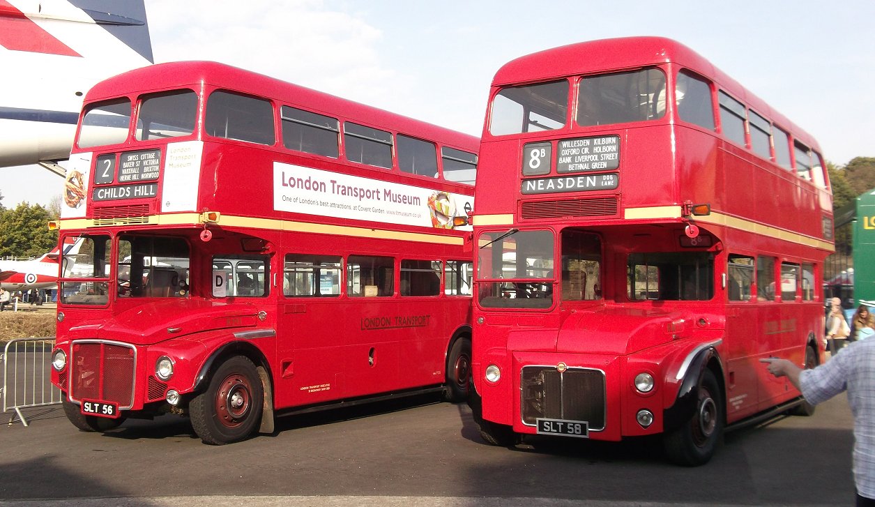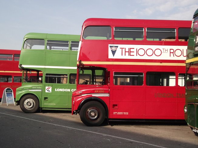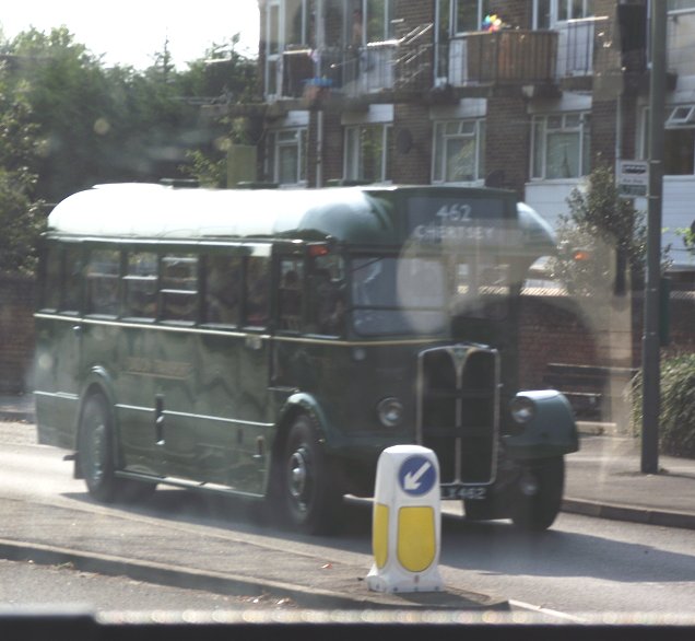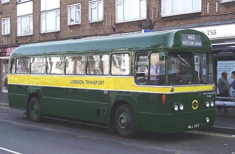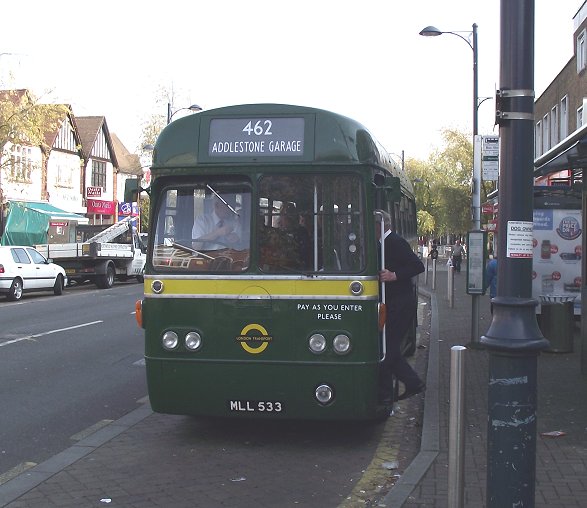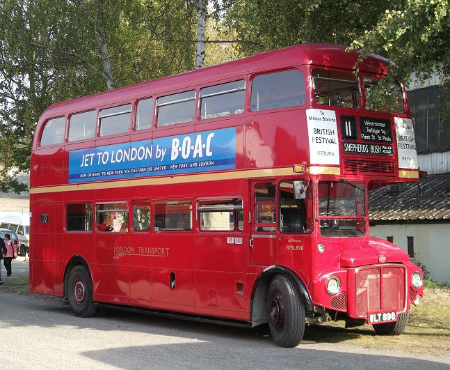 Brooklands Bus Running DaySunday 23rd October 2011Prepared by Ian Smith, 25th October 2011BrooklandsRoutemastersAway from the golden oldies, towards the new Cobham tent, was a collection of Routemasters. Two of the original short variety were RM1955 and RM752, the latter open-topped by London Transport for the Round London Sightseeing Tours.Behind them, under the trees, lurked one of the early long variety, RML898, intended for replacing similar-sized trolleybuses but meeting union opposition for unrewarded productivity increases. More of the long variety were lined up, with a shining RML2440 in Country green, RML2272 in Central red, short RM2216 in show-bus 1933-style livery, and RML2412 in London Country green and yellow. RM1000 was there, as was RMC1476 in NBC green and white. RM140 was an earlier one, but RM8, strangely was one of both the first and last: first to be built, last into service, as for many years it was the Chiswick test bus, before finally going to Sidcup. Standing in front of Concorde were prototypes RM1 - the very first - and unique Leyland-engined Weymann-bodied RML3. I was about to visit the Cobham tent when, dare I say it, something more interesting, and certainly more transient, came along, in the shape of RF146 departing on a 462 trip to Addlestone. Being one who prefers my buses active rather than stuffed, I asked if I could join them.. 462: Weybridge (Vickers Works) - Addlestone Garage, RF146We loaded up at the dolly stop, made our turn, and threaded our way out along the narrow road past the Mercedes_Benz emporium, onto the Byfleet road. We turned left, as though to head for Cobham, then turned left again at the roundabout to climb up towards Weybridge Station. At the roundabout there we turned half-right onto Hanger Hill. That took us down through the woods to the double roundabout at the east end of Weybridge. We turned left down into Weybridge High Street, then right along Balfour Road towards Addlestone. There we trundled along Station Road and over the level crossing, and on along to the old Addlestone Garage site (long ago built on) and on to the stop just beyond the roundabout. There we paused for photos. To turn for the return journey we had to go half-way to Chertsey to find a roundabout, turning right along Addlestone High Street and driving out of the village. After rounding the big roundabout we returned towards Addlestone, meeting first T792, then RLH48, then RF600 on successive 462s to various destinations. Photographing them as they passed was just a matter of luck - or not. Back on Station Road we saw the lights flash and the barriers go down at the level crossing. After a few minutes an eastbound electric train headed for Woking. The barriers stayed down. After a few minutes more a westbound electric train crossed over into the station. The barriers stayed down. After a while a 66 rumbled across eastbounds with a track maintenance train of track and ballast. The barriers went up. We headed back to Weybridge, then up to Weybridge Station, passing red RLH23 on the 462 as we went. We continued round to Brooklands, where we pulled up behind RF366, which was loading up... Part 5: RF366All photos by Ian Smith. Click on any of them for a larger picture.