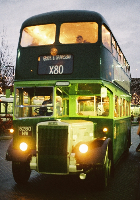 Trident 17938 arrived on the 96, and Arriva Medway Town's Volvo /Alexander 6404 arrived on a 701. Then the growl of a Leyland engine was heard, and out of the darkness came a half-cab Leyland wearing livery much the same as the pre-war Leyland TDs wore in these parts: two-tone green. It was the Leeds Corporation PD3/5: 5280NW.