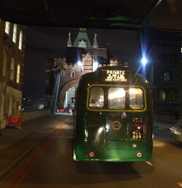 We wiggled our way down to Ludgate Circus, and turned up Ludgate Hill towards St.Paul's Cathedral. We passed an early RML on tour duty outside the west front. We continued along into the City, along Cannon Street and down to Monument Station. The Monument itself, brilliantly floodlit, was visible over the rooftops. We turned right over London Bridge, with an excellent view over the Pool of London to Tower Bridge, similarly using up the World's resources to provide us with enjoyment.
