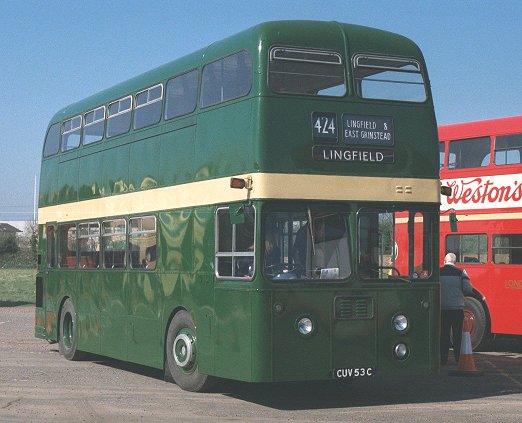 Working RMLsThe two oldest RMLs, from the first batch built when the Unions would not accept the longer buses generally, were both at Brooklands for London United. ER880 wears London United Tramways livery and its original number, while RML881 wears later London United livery with a grey band.