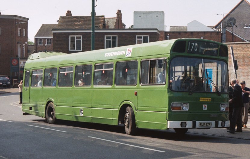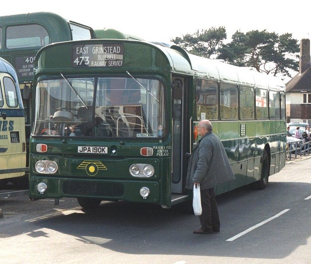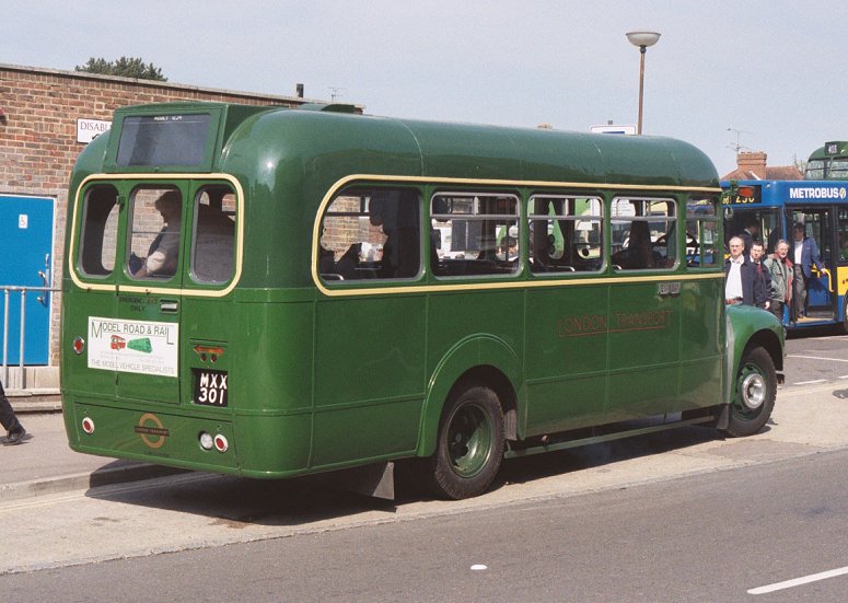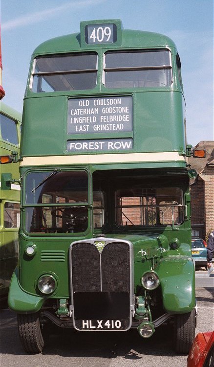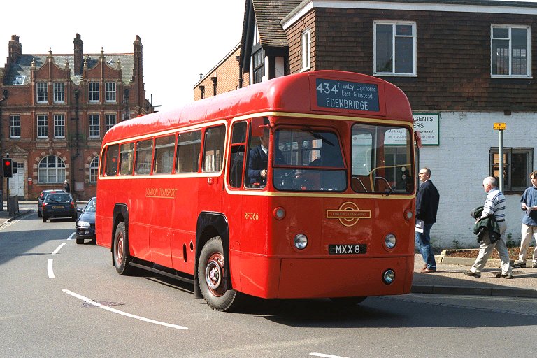 East Grinstead Running DaySunday April 21st 2002Prepared by Ian Smith, 4th May 2002Part 2: Medley at East GrinsteadI walked down into King Street, the main bus station for the day. The log-jam in the bus-park was resolving, and a stream of green buses was arriving at the stops for the 11 o'clock or thereabouts departures. GS1 had already been busy, coming in from Holland via Oxted. RF679 had run round the block again and was preparing to depart for Crawley. The traffic jams had meant that there had not been enough time to find the ladders to change the blinds for the 473 set.XF3, resplendent in London Transport Lincoln green and cream, was loading well for a journey on the 409, while RF633 was packing them in for the 1055 westwards journey to Turners Hill over the 434 route. This marked part of a slightly different emphasis this year, with more buses on the westward routes towards Crawley, and markedly fewer buses between Westerham, Edenbridge, Chart and Oxted. Another theme this year was an increased Southdown participation. East Grinstead was once a border town, with London Transport running in from north-east, north-west and north, Southdown from the southern aspects, and Maidstone & District from the east. Long National RUF37R was a reminder of National Bus Company days, and was wearing route 170 blinds for the 1100 trip to Sheffield Park to connect with the Bluebell Railway. Parked round the corner was RP90, ready for an active day moving crowds to and from the Bluebell Railway at Kingscote. Then open-doorway red RF366 came onto the stand to take up duties on an eastbound 434 to Edenbridge, positively glowing in the sunshine. Also glowing red was RF269, but that was just the reflection of a pair of red Leyland Nationals and a red RT in the bus park, reflecting from the deep shine on the GreenLine coach. Also representing GreenLine was modernised RF168, and Cobham's T504. Also in the old bus station were a pair of green roofbox RTs: RT1702 Group's RT227 wearing a set of 403 Express blinds, and Cobham's RT593 dressed for the 409. First production Routemaster RM8 was also there, proudly wearing its new paint. After a good look round I felt it was time for a ride. The original queues had subsided, except for GS rides. What was next.....?