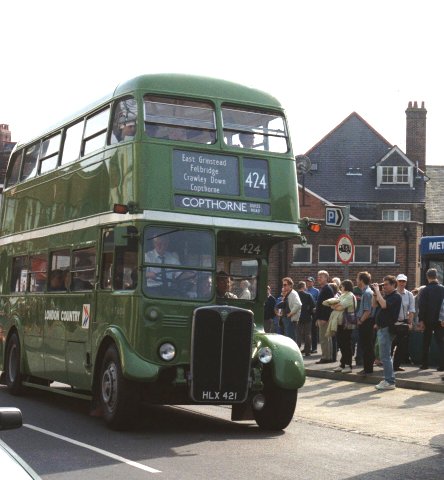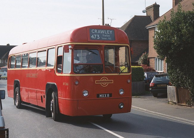 East Grinstead Running DaySunday April 21st 2002Prepared by Ian Smith, 12th May 2002Part 6: DeparturesBy now the afternoon was well on, and people were mostly being careful what they caught, to ensure that they were in the right place at the right time for their journeys home. Some local services were still going out, although the buses that had been resting at lunch-time were active now.RF366 set off for Crawley on the 473, taking some bound for Three Bridges station, while RF626 was still busy on a local 434 turn to Edenbridge and back. RT604, in its NBC green, was out and about on the 424, operating short runs out to Copthorne, while GreenLine-liveried RT3491 was taking a turn on the 409.
