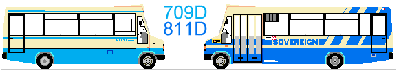 Sovereign Harrow 455-461These seven were renewals for some of the Harrow operation 811Ds. But they did not stay there. Before long they were in use elsewhere in the Sovereign operations.Later liveriesSovereign adopted a livery including fashionable upswept diagonals at the rear, still using blue and cream, in about 1995. Later still repaints received the Yorkshire Coastliner style, found, as the name implies, in other Blazefield companies. This had black skirts, with a deeper blue band above, incorporating a red band.Sovereign closedown