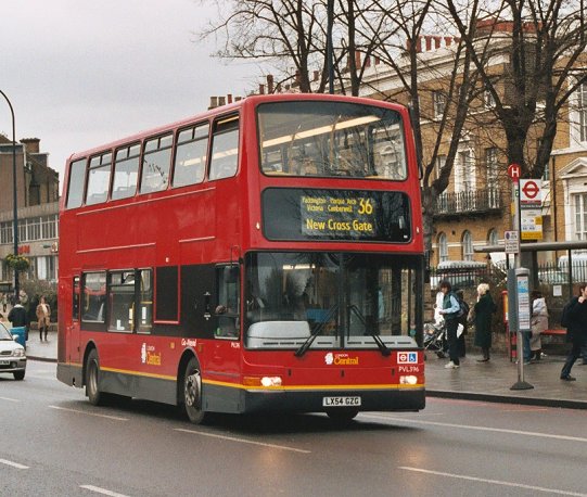 The new order on the 36 was shown by Volvo President VPL396, which also turned into the garage at the end of its journey from town. Blue Volvo Olympian NV132 came past from the east, to turn in at the other entrance. This is another generation of buses that was outlived by the RMs in service: they have nearly all been sold or relegated to training duties now. The blue coloration is presumably due to Londoners' insistence on trying to climb aboard anything large and red, irrespective of what it says on the front. A modern equivalent of the RF slipped past too, in the shape of Travel London's DP15 on the P13.
