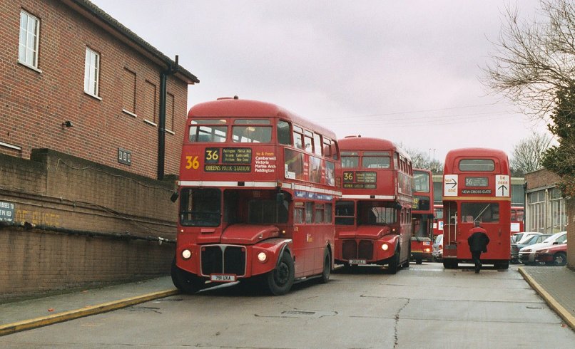 At last, as if a bung had been pulled, Route 36 Routemasters started to appear. RM2151 arrived from town, terminating on a routine 36, followed by Stagecoach National-liveried RML2665, heading for Grove Park again on the 36B. RM687 pulled out from the garage, going round the block on another test run.