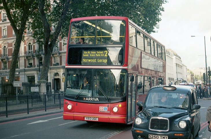 Of course, there was not an RM or RML in sight. But plenty of other buses. Round the corner popped a tiny (ie RF-size) Dart/Plaxton (DP33 of Travel London) on the C1, setting off to wriggle its way through to Kensington. Rather larger, but NOT an ECW-bodied Leyland Olympian, was DAF/Alexander DLA313 on route 2.